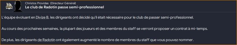 Le passage au statut semi-professionnel nous a permis de sécuriser quelques un de nos joueurs, mais un gros ménage a été effectué. Une majorité de joueurs se sont vus rétrogradés en équipe réserve (désormais en sixième division après leur montée de la septième division). Certains d’entre eux ont préféré partir vers d’autres cieux.