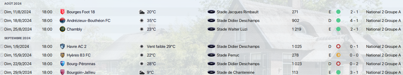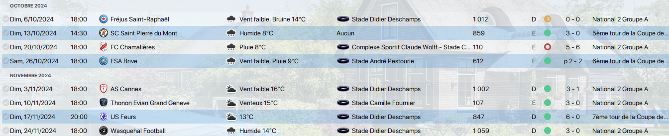 titulaire contre SC Pierre du Mont 8.0 et buteur x1. Titulaire contre Chamalieres 8.8 1 passe décisive 1 but. Titulaire contre Brive 6.4 Titulaire contre Thonon 7.2 Titulaire contre Feurs 10.0 buteurs x2, 2 passes décisives. Titulaire contre Wasquehal 8.5 buteur x2 - Etienne DAUDE