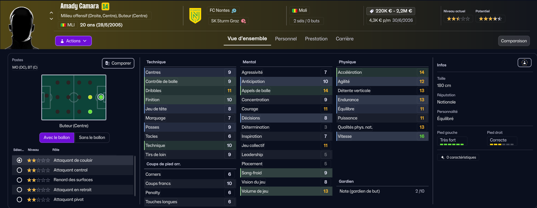 Amady Camara apportera un peu de nombre en attaque, mais ne devrait pas jouer beaucoup. Il a l’avantage d’avoir une qualité essentielle pour ma tactique : il peut jouer milieu offensif !
