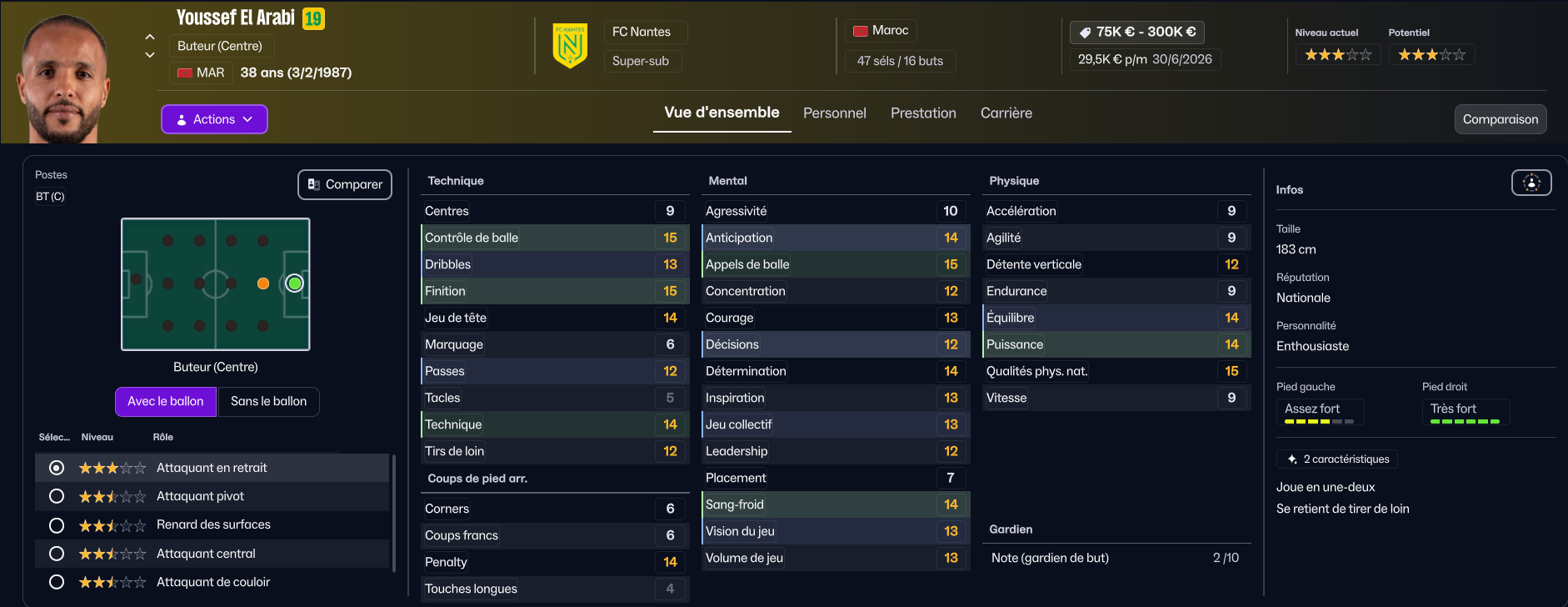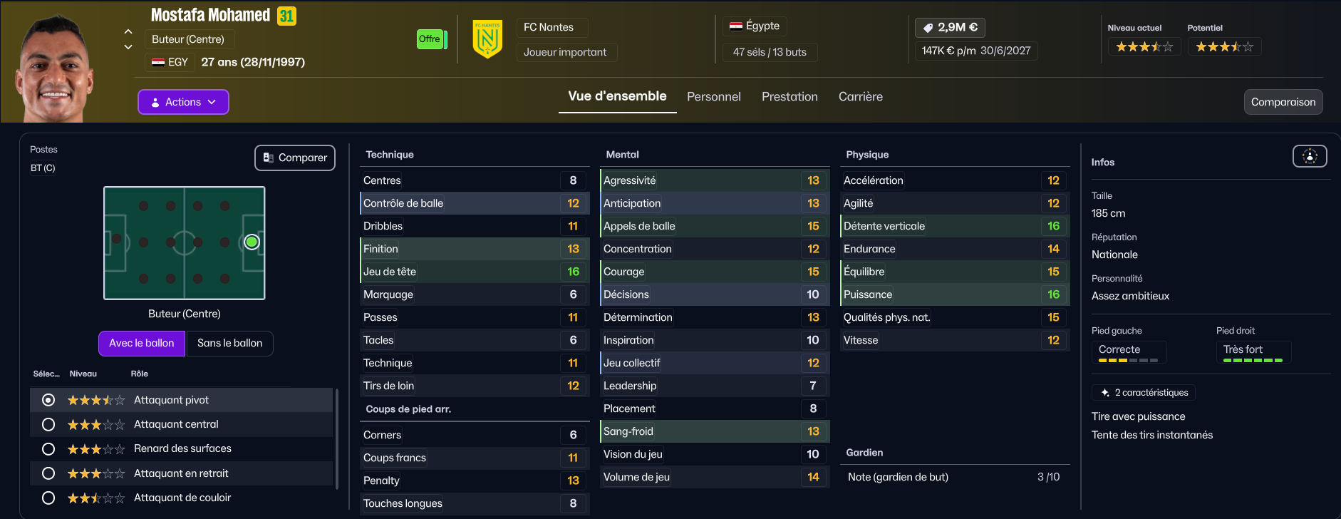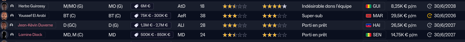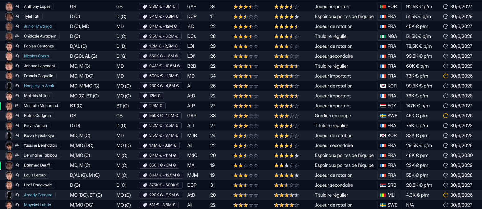 En revanche, s’il y a bien un joueur qui va partir, c’est Mostafa Mohamed. Il a des stats correctes, mais ne correspond pas à notre tactique (vous comprendrez quand vous verrez la tactique). Trabzonspor est très intéressé par le joueur, et le club turc a même déjà envoyé une offre, mais des négociations sont en cours car le montant qu’ils proposent est insuffisant. Rennes et Wolverhampton seraient aussi intéressés.
