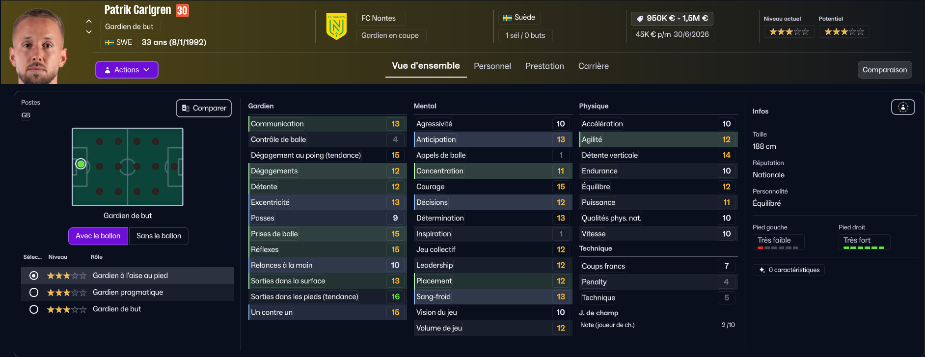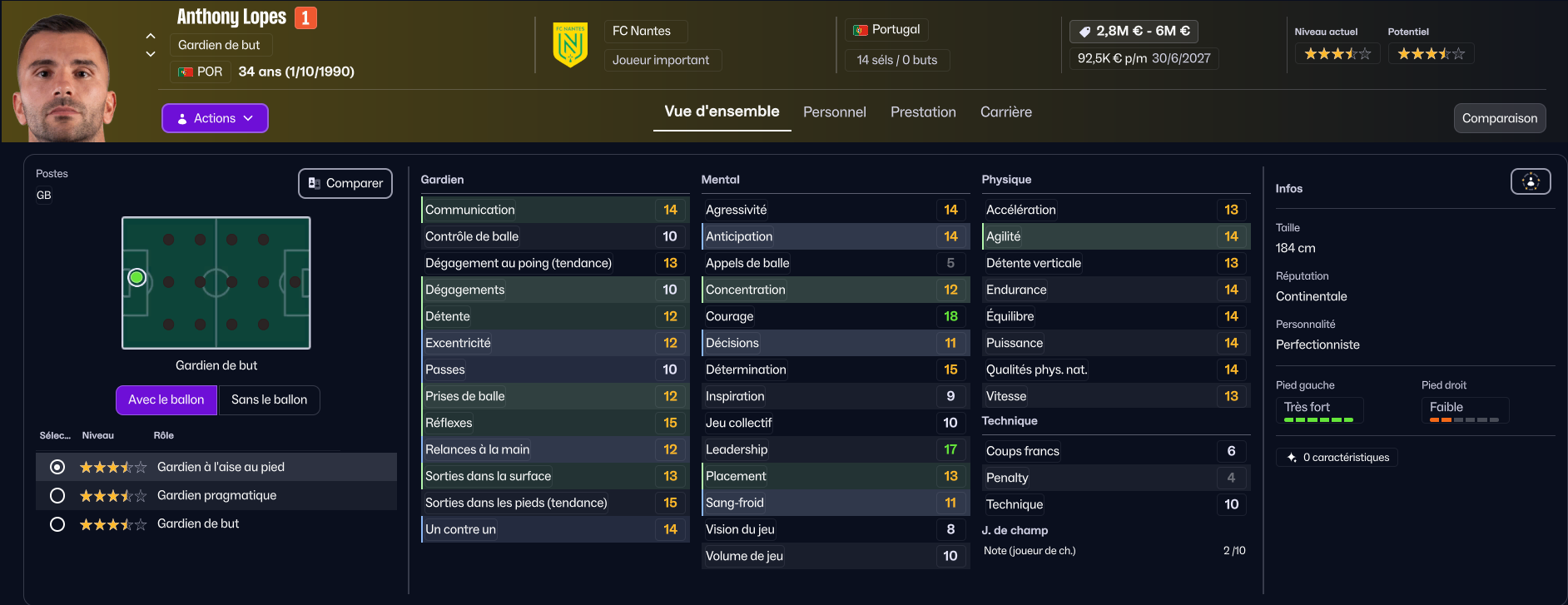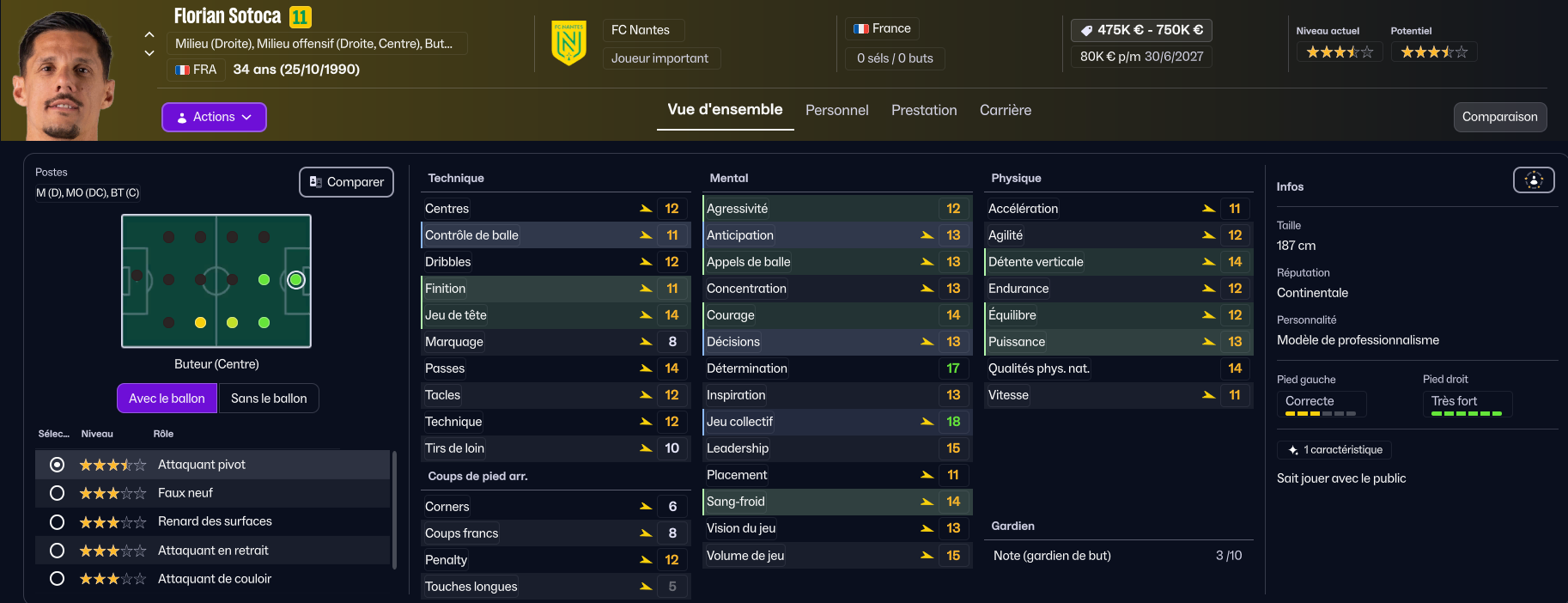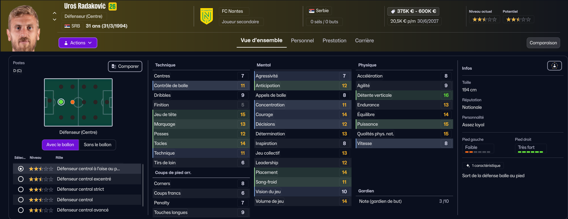 En revanche, s’il y a bien un joueur qui va partir, c’est Mostafa Mohamed. Il a des stats correctes, mais ne correspond pas à notre tactique (vous comprendrez quand vous verrez la tactique). Trabzonspor est très intéressé par le joueur, et le club turc a même déjà envoyé une offre, mais des négociations sont en cours car le montant qu’ils proposent est insuffisant. Rennes et Wolverhampton seraient aussi intéressés.