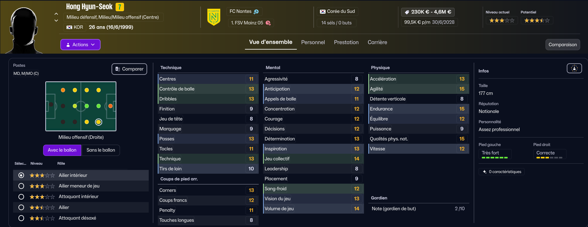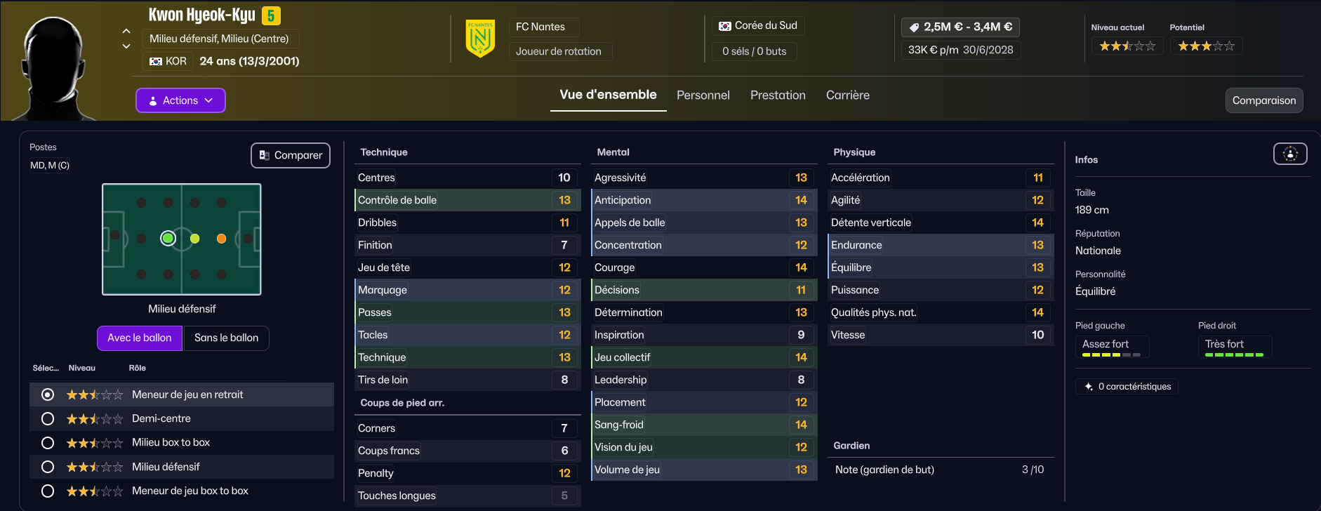 Le sud-coréen Kwon Hyeok-Kyu sera notre milieu de terrain remplaçant. Plutôt polyvalent, il est plutôt bon dans tous les domaines, et dispose encore d’une petite marge de progression à 24 ans.
