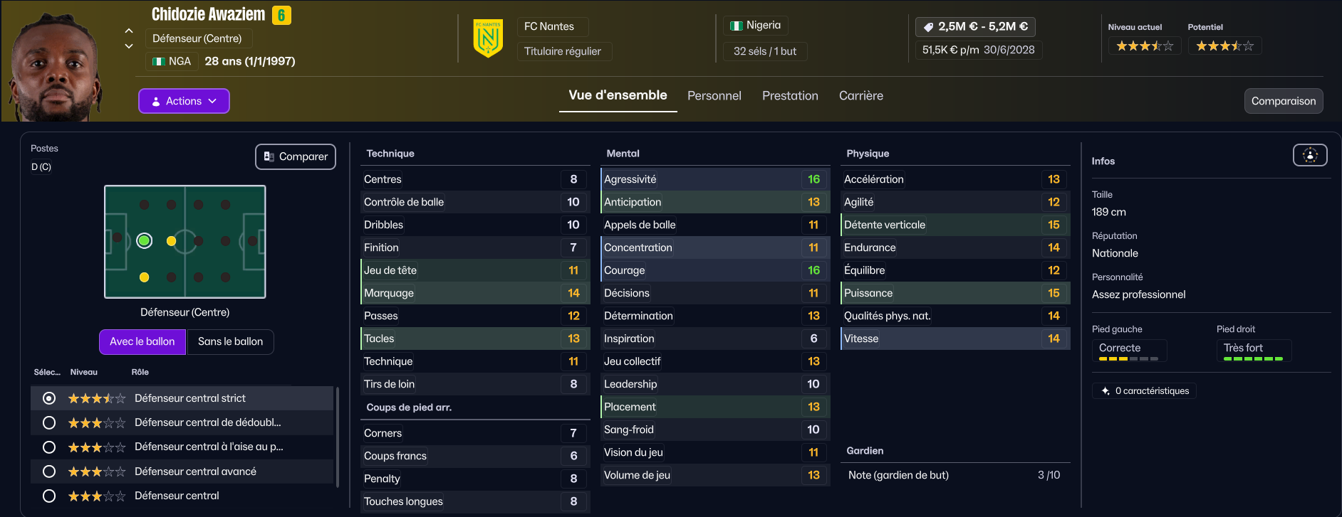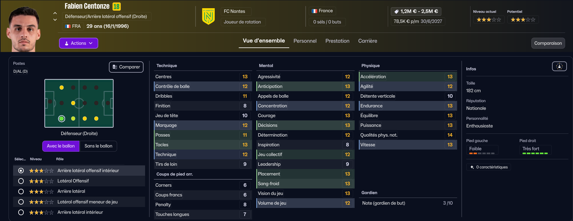 Latéral droit de métier, Amian devra être remplaçant en défense centrale, car il ne peut pas jouer piston. Cependant, son temps de jeu de « titulaire régulier », qu’il refuse de réduire, fait que je pense le vendre pour acheter un défenseur central de métier (le club italien de Sassuolo est intéressé), mais on manque de joueurs en défense, donc il faudrait recruter deux défenseurs…