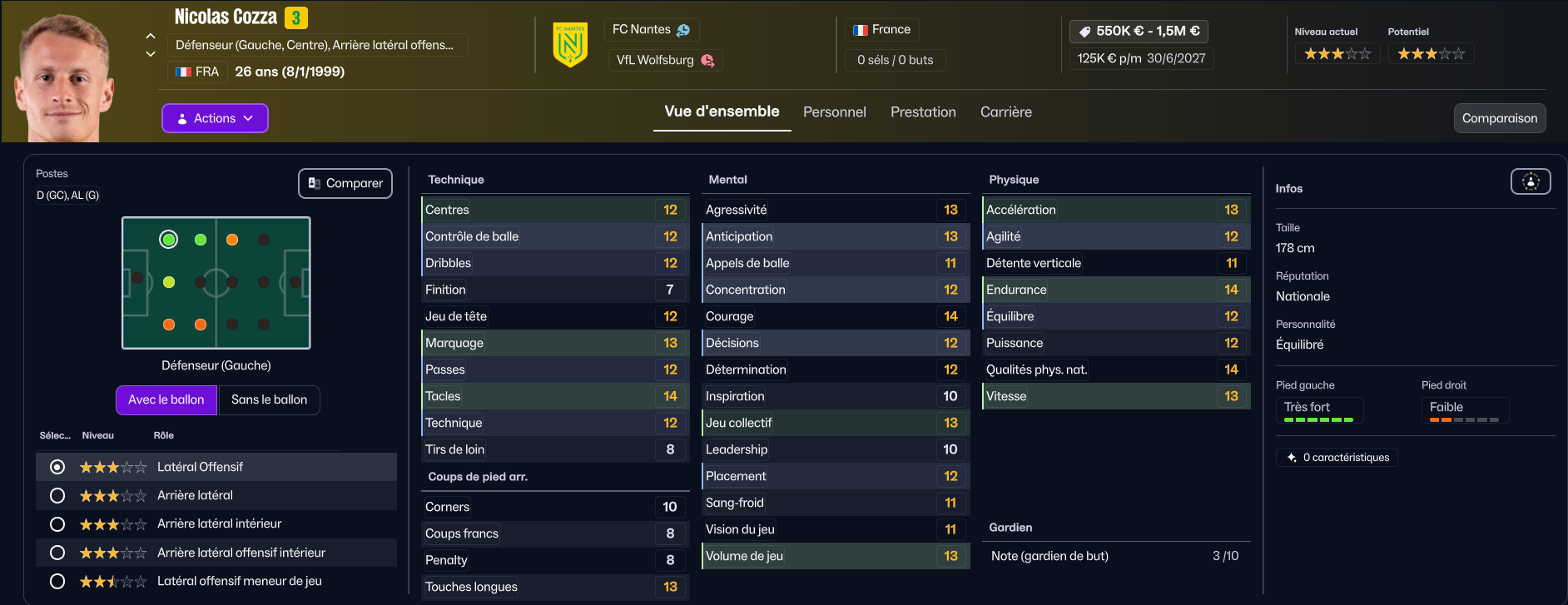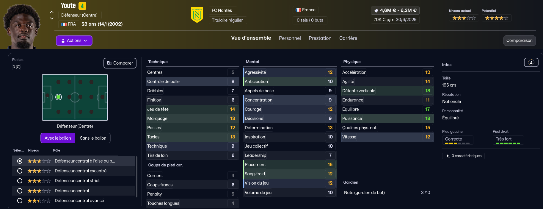 Notre troisième défenseur (car nous utiliserons une défense à trois) sera le très jeune Tylel Tati ! A seulement 17 ans, le jeune joueur formé au club sera titulaire cette saison. Il est déjà très correct pour de la Ligue 1, et sa marge de progression est hallucinante !