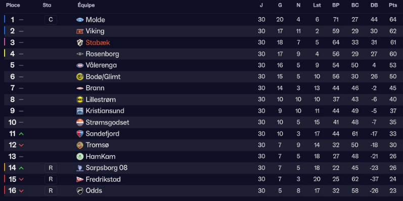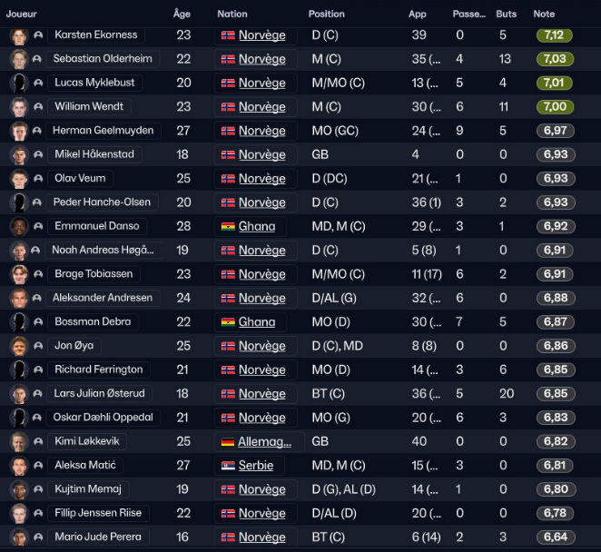Après c’était ultra serré en haut du classement avec Rosenborg qui finit derriere nous avec 1 point de moins. C’est aussi l’une de mes raison de mon changement tactique, le haut de tableau étant tellement serré et ma dynamique commençant a être mauvaise en championnat, je voulais y remédier.