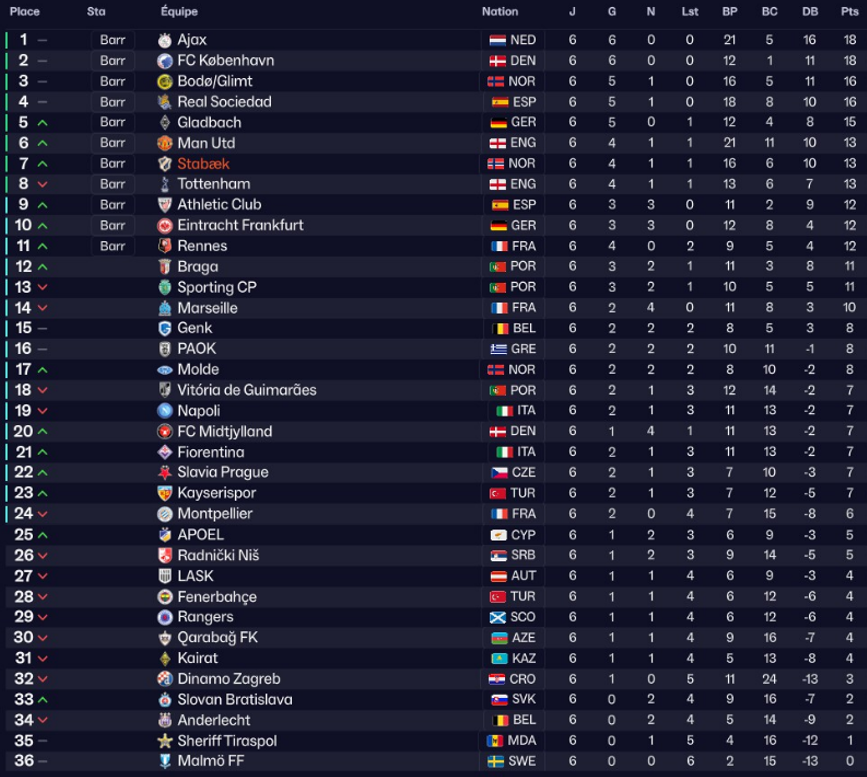 En effet, nous sommes 7ème et surtout déjà qualifié pour le barrage en février. Mon objectif maintenant sera d’essayer de ne pas perdre face à manchester United afin de me qualifié directement en 8ème de finale afin d’alléger le calendrier lors de la préparation d’avant saison.