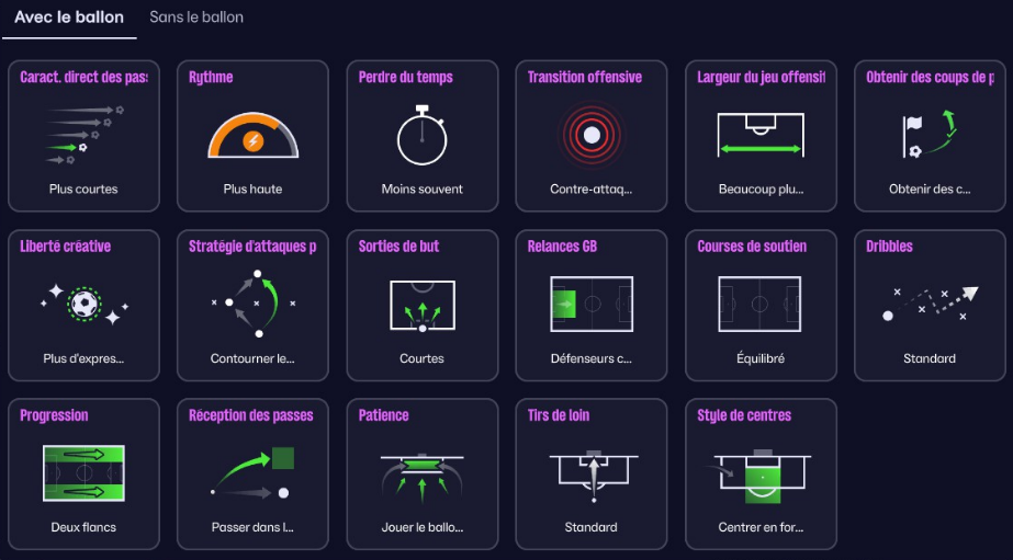 Cette tactique en 4-3-3 MD en phase de possession est trĂšs offensive et se base sur la possession et des passes courtes mais rapide, un jeu qui passe par les ailes avec des centres vers lâattaquant. En phase dĂ©fensive nous passons Ă un 4-2-3-1 avec deux milieu dĂ©fensif. Nous nous basons sur un pressing intense qui repousse les adversaires sur les cotĂ©s afin de les forcer Ă centrer. La taille et qualitĂ© aĂ©rienne de nos dĂ©fenseurs fera le reste.