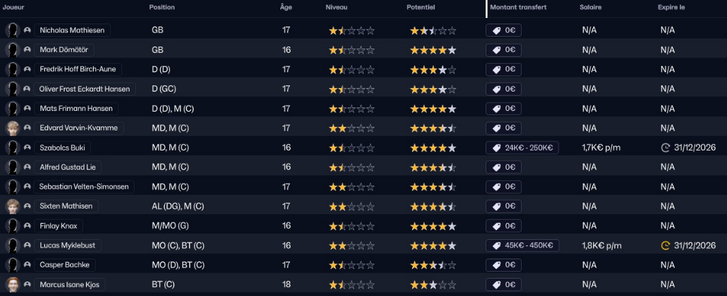 Les joueurs de lâĂ©quipe 2 sont les joueurs prĂȘtĂ© au club ou en prĂȘt ailleurs (je ne vais pas faire jouer des joueurs qui ne resteront pas), les vieux joueurs qui ne sont pas encore partis et quelques jeunes que je passerais surement chez mes U19. Cette Ă©quipe me servira de rĂ©serve⊠Les jeunes en prĂȘt intĂ©greront peut ĂȘtre lâeffectif Ă leur retour ou seront vendu.