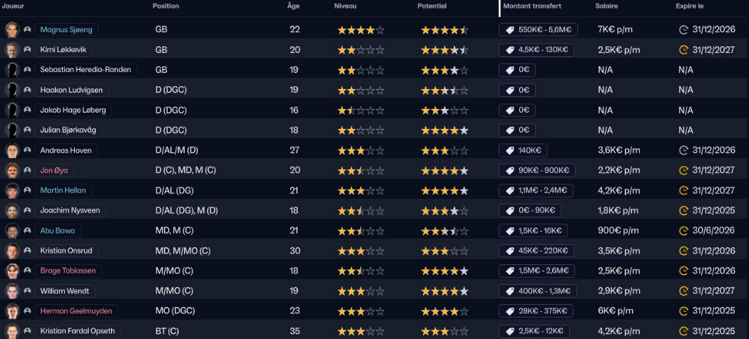 Tout dâabord, jâai mon gardien de 29 ans Sondre RossBach qui mâa indiquĂ© quâil voulait voir les opportunitĂ© quâil aura Ă la fin de son contrat. Mon jeune arriĂšre gauche de 19 ans Aleksander Andresen sur qui je comptais beaucoup est venu quelques jours plus tard pour la mĂȘme chose alors que je lui avait proposer une prolongation de contratâŠ