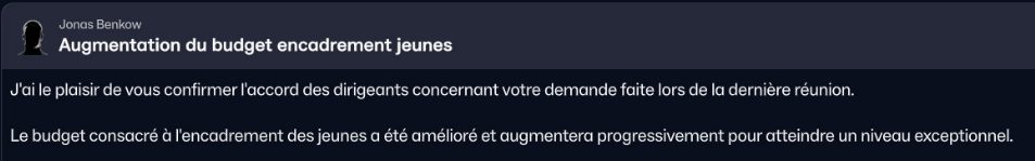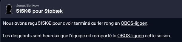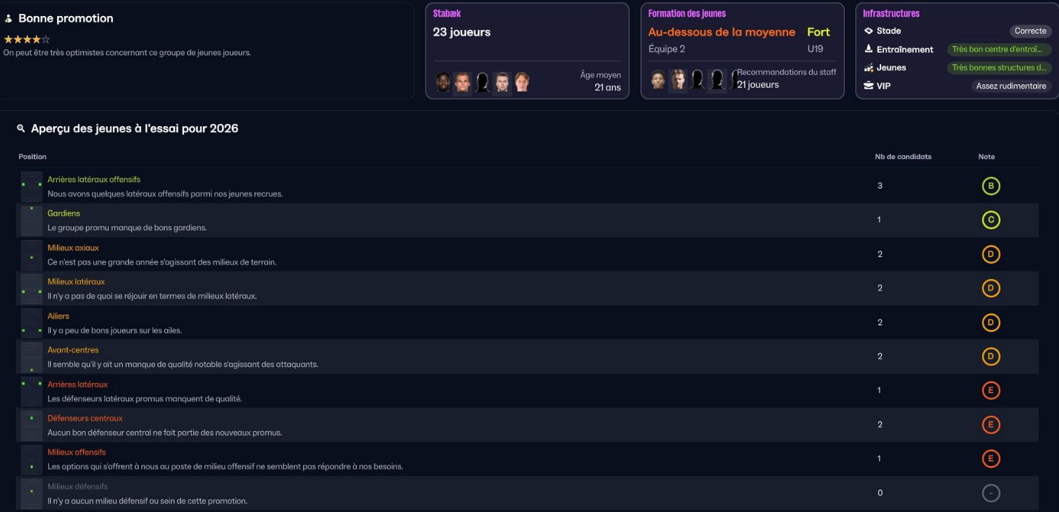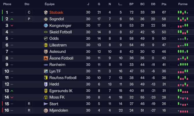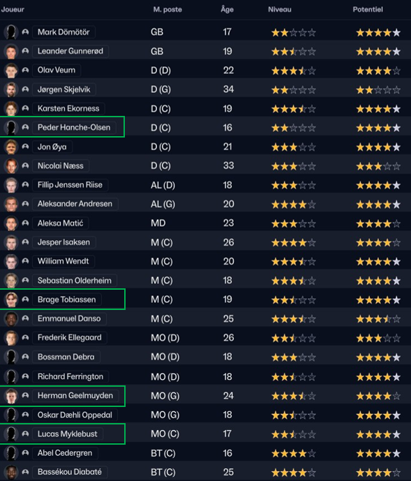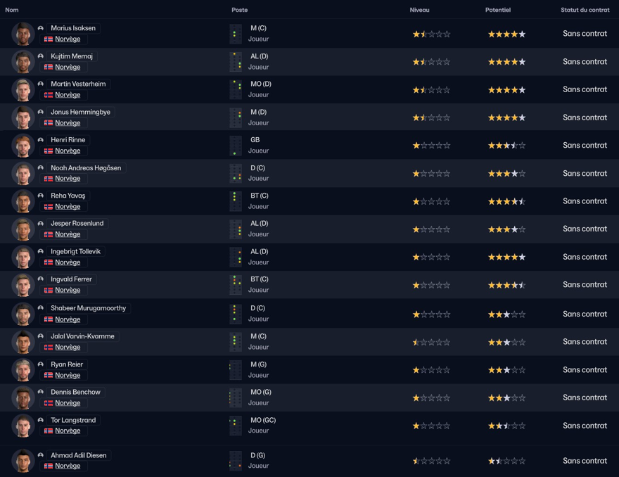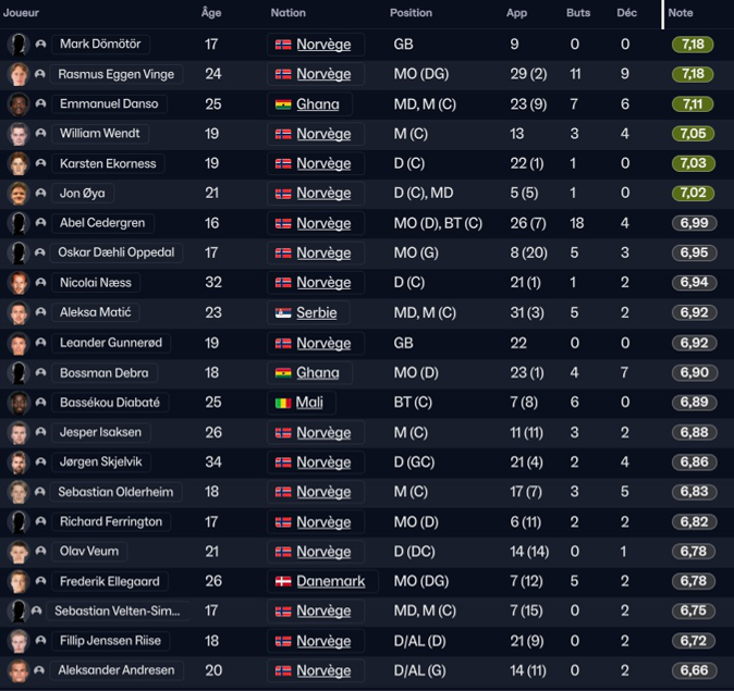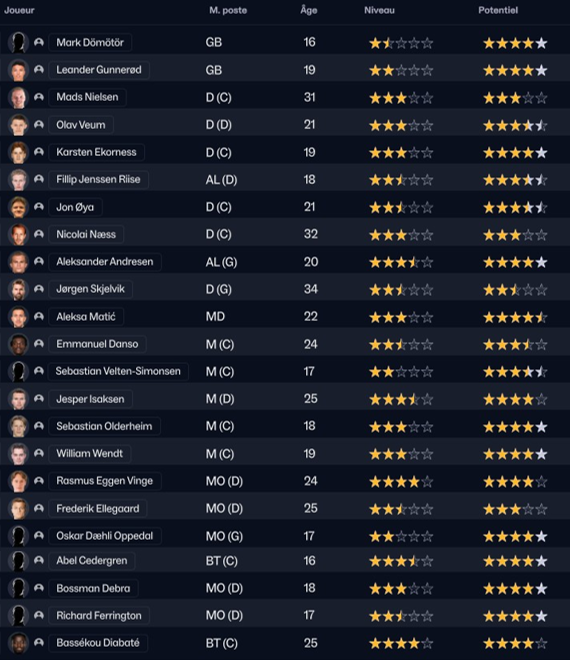 Câest tout pour cette fournĂ©e de regens. Mon premier avis sur cette fournĂ©e est quâil y a du potentiel. Mais il y a aussi du potentiel pour amĂ©liorer les suivantes, avec de meilleurs personnalitĂ©s, dĂ©terminations et notes moyenne. On a beaucoup dâaxes de progression pour les futurs fournĂ©e de regens. Câest dans cette optique que jâai changer mon responsable de la formation des jeunes. Il nâest pas NorvĂ©gien donc il ne connait pas parfaitement le pays et il va falloir 2/3 ans pour quâil me trouve les meilleurs. Mais ça permettra de stabiliser le club en premiĂšre division.