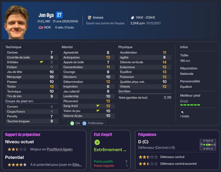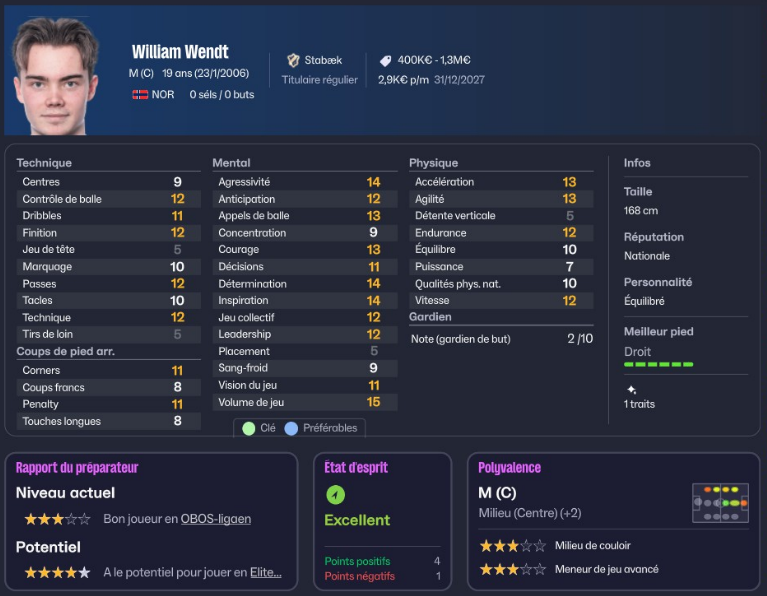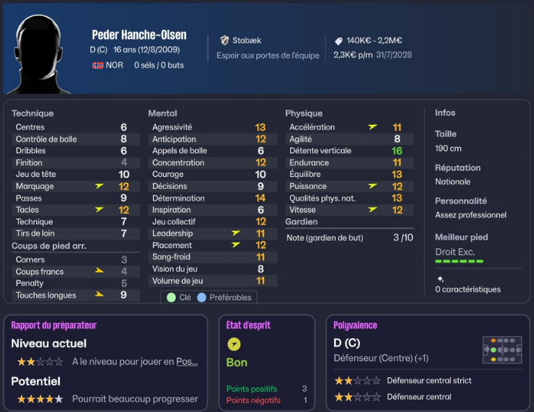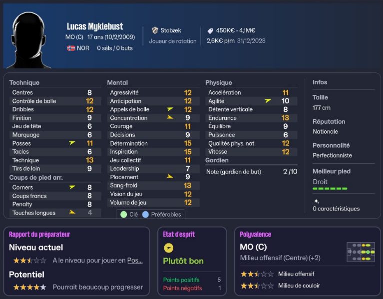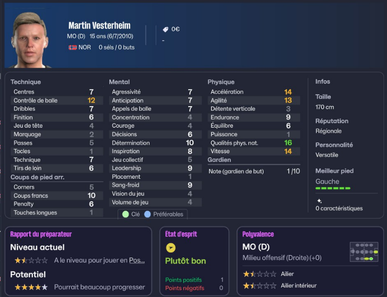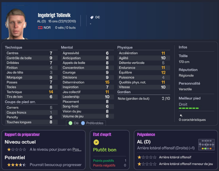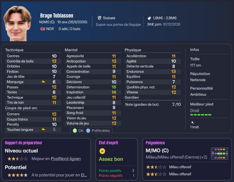 Pour finir, Ingvald Ferrer est mon autre buteur actuellement. Puisque je suis déjà fournis cette année à ce poste, je vais le former en tant que milieu de terrain. Ses dribles et tacles peuvent me permettre de garder ou récupérer pas mal de ballon. A part ça ses notes sont équilibré. Mais il va falloir travailler sur la détermination et la personnalité .