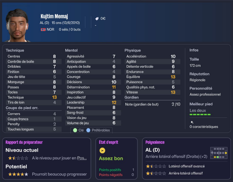 Kutjim Memaj Ă des notes assez Ă©quilibrĂ© et une bonne personnalitĂ© . Je vais le former en tant que dĂ©fenseur latĂ©ral gauche ET droit puisquâil a les deux pieds. Il faudra Ă©galement travailler le volume de jeu .