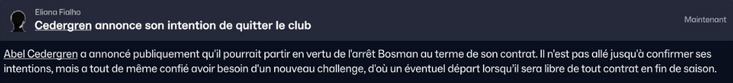 Abel Cedergren Ă annoncer son intention de quitter le club Ă lâissue de son contrat en juillet 2027.