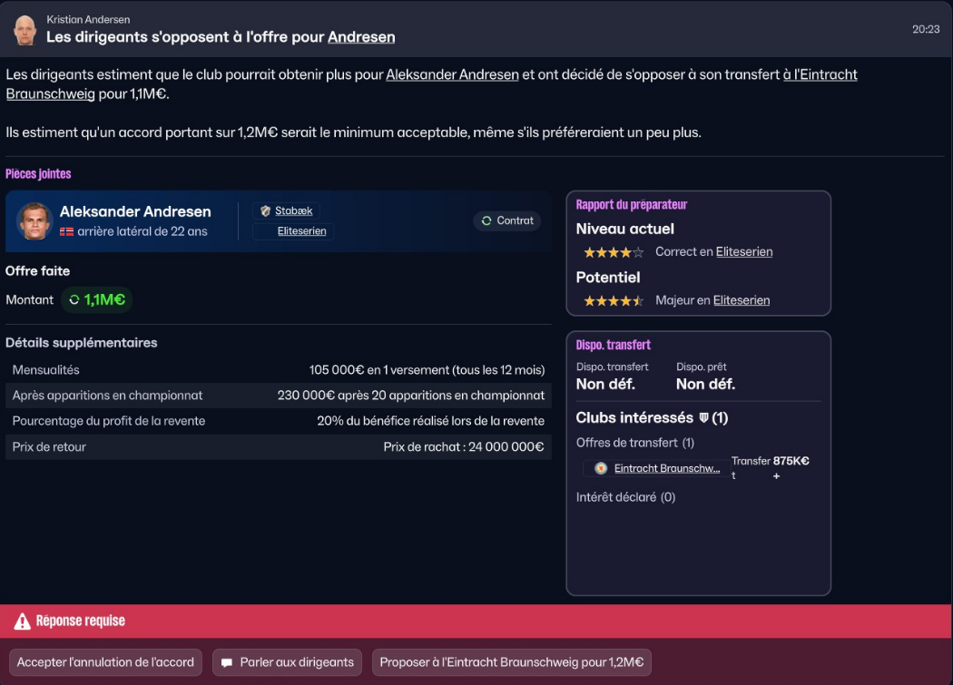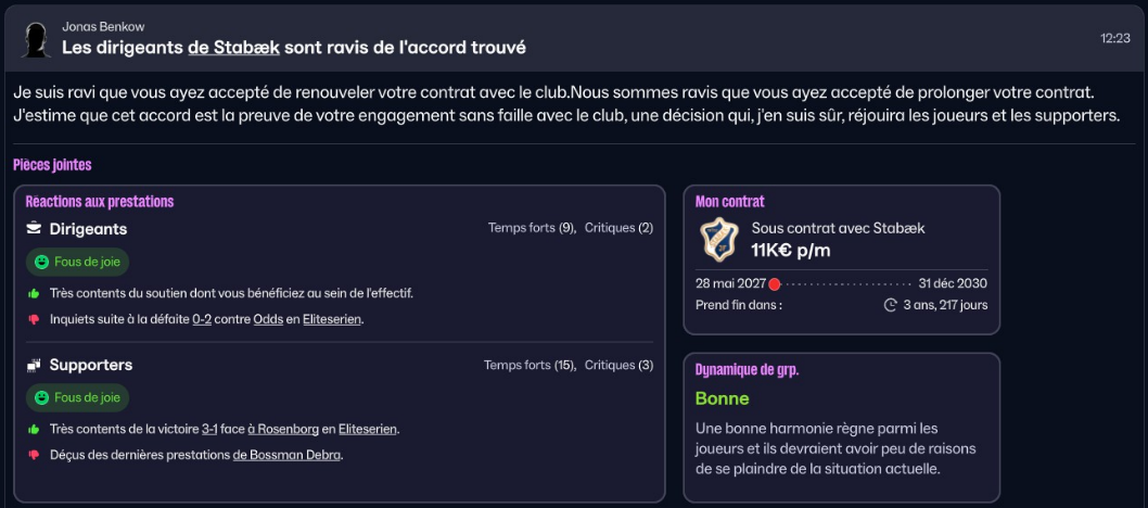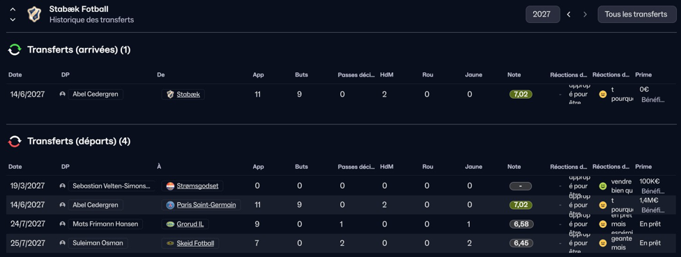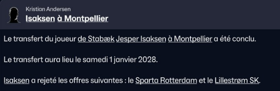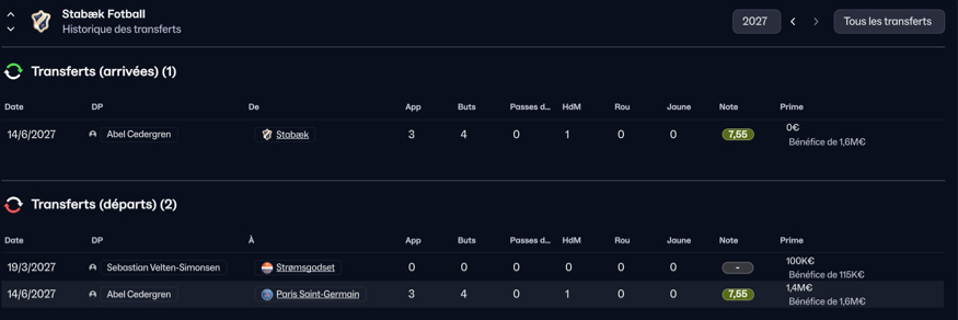 Cette technique me mets mĂȘme dans lâembarras. Jâai mis le transfert de Cedergren Ă lâĂ©tĂ© 2027 avec le PSG. Le message suivant me proposais de me faire prĂȘter Cedergren par le PSG, jâai accepter en pensant que câĂ©tait jusquâĂ lâĂ©tĂ© 2027. Finalement, il rejoint bien le PSG en 2027 mais ensuite, le PSG me le prĂȘte dans la foulĂ©e jusquâĂ lâĂ©tĂ© 2028.