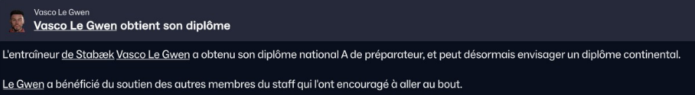 Le coach Vasco Le Gwen obtient son diplÎme mais ne bénéficie pas encore de la possibilité de continuer sa formation. Il semble que les dirigeants préfÚrent nous autoriser nos études en fin de saison.