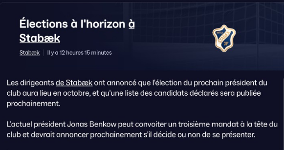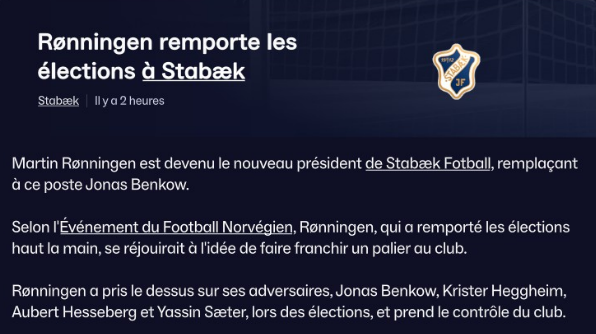 Des Ă©lections a Stabaek Fotball pour Ă©lire le nouveau prĂ©sident on eu lieu fin Octobre, lâactuel prĂ©sident sâest reprĂ©senter pour un troisiĂšme mandat.