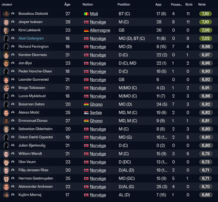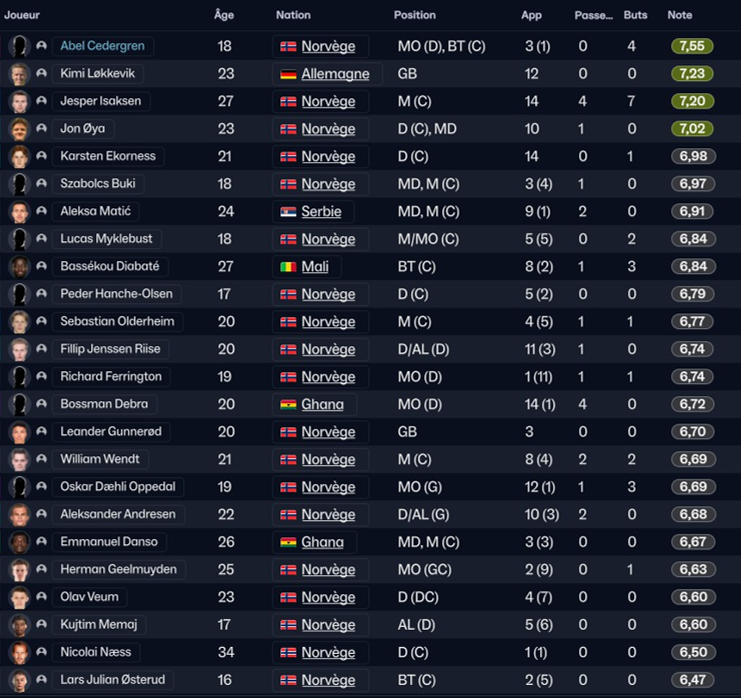 Le moins significatif Abel Cedergren Ă une excellente moyenne mais nâa jouer que 4 matchs dont 3 depuis le 14 juin et son pret. Je ne voulais pas trop le faire jouer avant son prĂȘt et lâavais mis 3Ăšme de la hiĂ©rarchie surtout que ses performances nâĂ©taient pas terrible lors des amicaux.