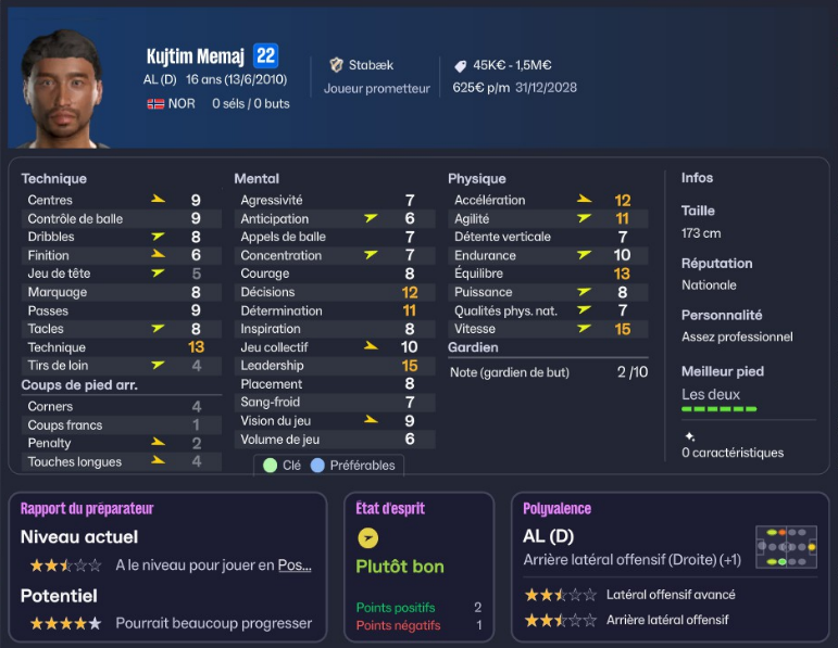 Kutjim Memaj est le premier Newgen de ma partie que jâintĂšgre en Ă©quipe premiĂšre. Il est apparut la saison 2026 et jâavais dĂ©cider de le former au poste de dĂ©fenseur gauche. Il nâest pas totalement Ă lâaise Ă son poste mais je manque de dĂ©fenseur gauche. Il part en tant que remplaçant.