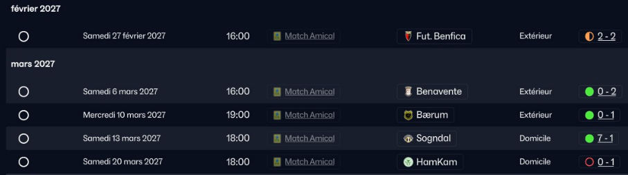Deux clubs portugais peu connu pour notre stage de prĂ©-saison puis 2 clubs de 2nd division pour faire monter le rythme. Enfin, on finit par une dĂ©faite face a HamKam club dâEliteserien.