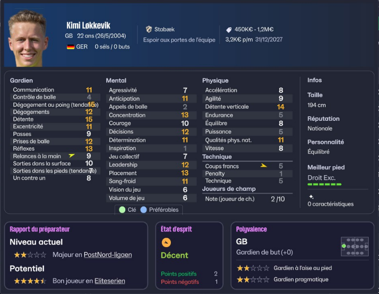 Kimi Lokkevik est un gardien qui trainait dans mon Ă©quipe rĂ©serve depuis le dĂ©but de la partie. Il nâavait pas un aussi haut potentiel que nos gardiens prĂ©cĂ©dents mais aprĂšs avoir atteint 22 ans, son potentiel sâest rĂ©vĂ©lĂ© :