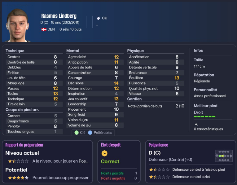 Rasmus Lindberg est le deuxiÚme défenseur central de cette promotion. Il a de plutÎt bonnes stats et surtout une bonne personnalité qui le fera bien progresser.