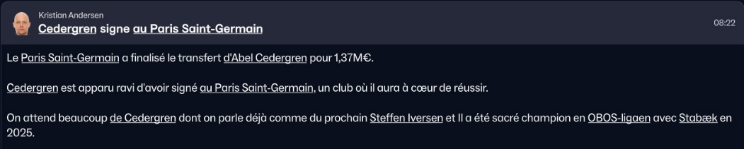 Tout de suite aprĂšs, jâai reçu un message du PSG me proposant le prĂȘt de Cedergren pour une saison. Jâai donc penser que câĂ©tait jusquâĂ lâĂ©tĂ© 2027 et jâai acceptĂ© lâoffre. Ce nâest que quelques jours plus tard que je me suis aperçus de lâerreur possible. Jâavais encore un doute jusquâĂ la date effective du transfert ou jâai vu Abel Cedergren faire lâaller retour Ă Paris pour signer son contrat avant de revenir en prĂȘt.