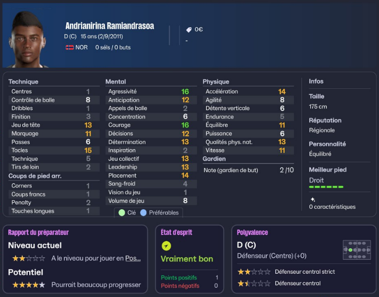 Andianirina Ramiandrasoa de son petit surnom Andi est lâun de nos meilleurs joueurs de cette promotion. DĂ©fenseur central, il a dĂ©jĂ un mental qui ferait pĂąlir certains de lâĂ©quipe premiĂšre. Il manque un peu de qualitĂ© technique mais il a le temps. Je pense compter sur lui dâici une ou deux saison.