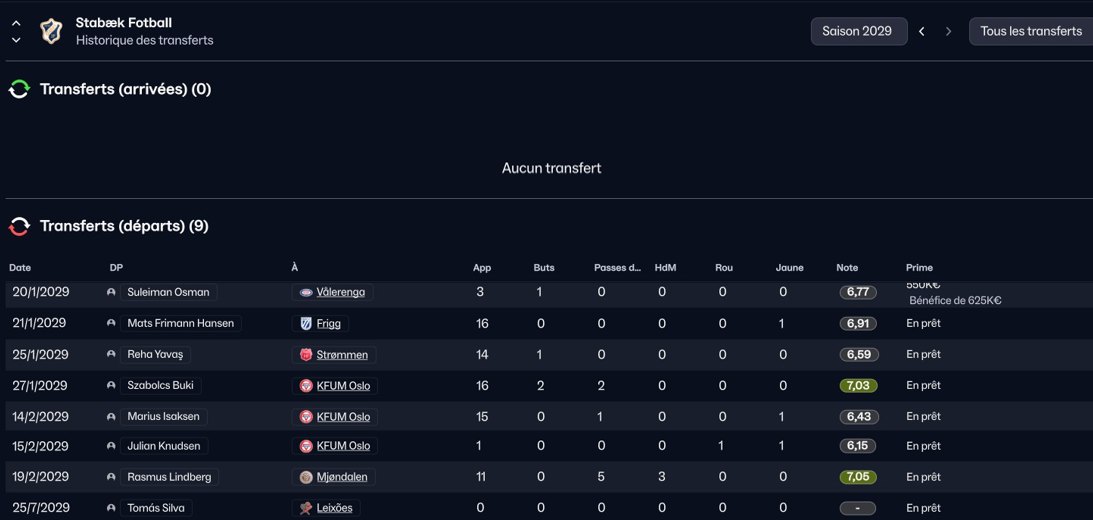 Aleksander Andresen est aussi excellent Ă son poste. Il attire dâailleurs des offres de transferts de nombreux clubs Ă©trangers (des offres de 2 Ă 4 millions dâeuros). Mais il nâest jamais intĂ©ressĂ© par ces offres donc je peux les refuser sans quâil vienne me voir ![]()