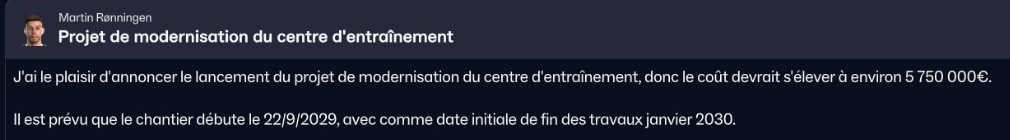 Et en ce mois de juillet, nous avons pu demander de nouvelles amĂ©lioration du centre dâentrainement qui seront terminĂ© en janvier 2030.