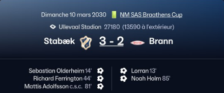 Nous serrons fort les fesses toute la 2nd mi-temps avant que Brann nâencaisse un 3Ăšme but avec un c.s.c de Mattis Adolfsson. Ce but vient assurer (ou presque) notre victoire. MĂȘme la rĂ©duction au score Ă la 85Ăšme minute ne vient pas me faire stressĂ© !!!
