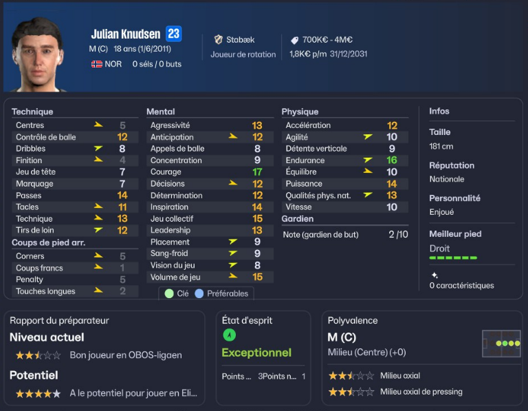 Julian Knudsen est un milieu centre que je vais devoir former à son nouveau poste de milieu offensif. Il vient étoffer ce secteur de jeu et remplacer Mario Jude Perrera qui ne jouait pas assez pour progresser.
