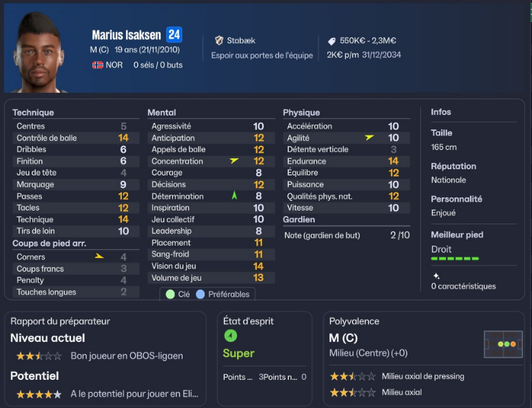 Comme son compĂšre, Marius Isaksen est milieu centre et va devoir ĂȘtre former Ă son nouveau poste. Il vient afin dâavoir un effectif plus grand afin de palier aux nombreuses blessures que cette tactique me promet.