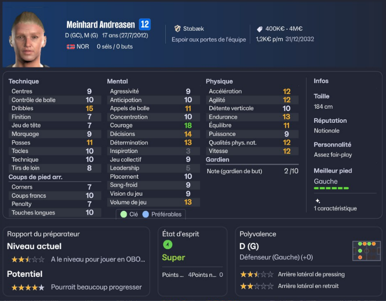 Ce polyvalent défenseur vient remplacer Jon Oya et jouera principalement défenseur central. Il peut également jouer à gauche ce qui me fait potentiellement 3 joueurs pouvant jouer défenseur gauche (Aleksander Andresen, Kujtim Memaj et Meinhard Andreasen) ainsi que 3 joueurs pouvant jouer défenseur droit (Olav Veum, Fillip Jenssen Riise et Kujtim Memaj).