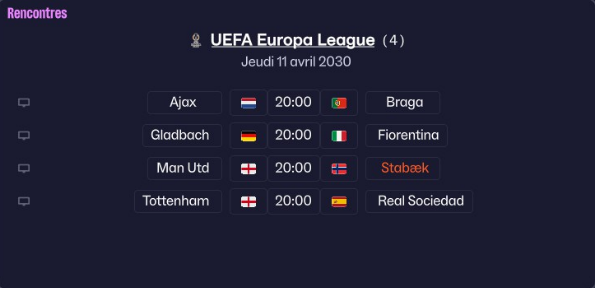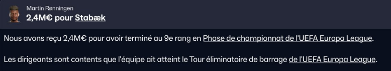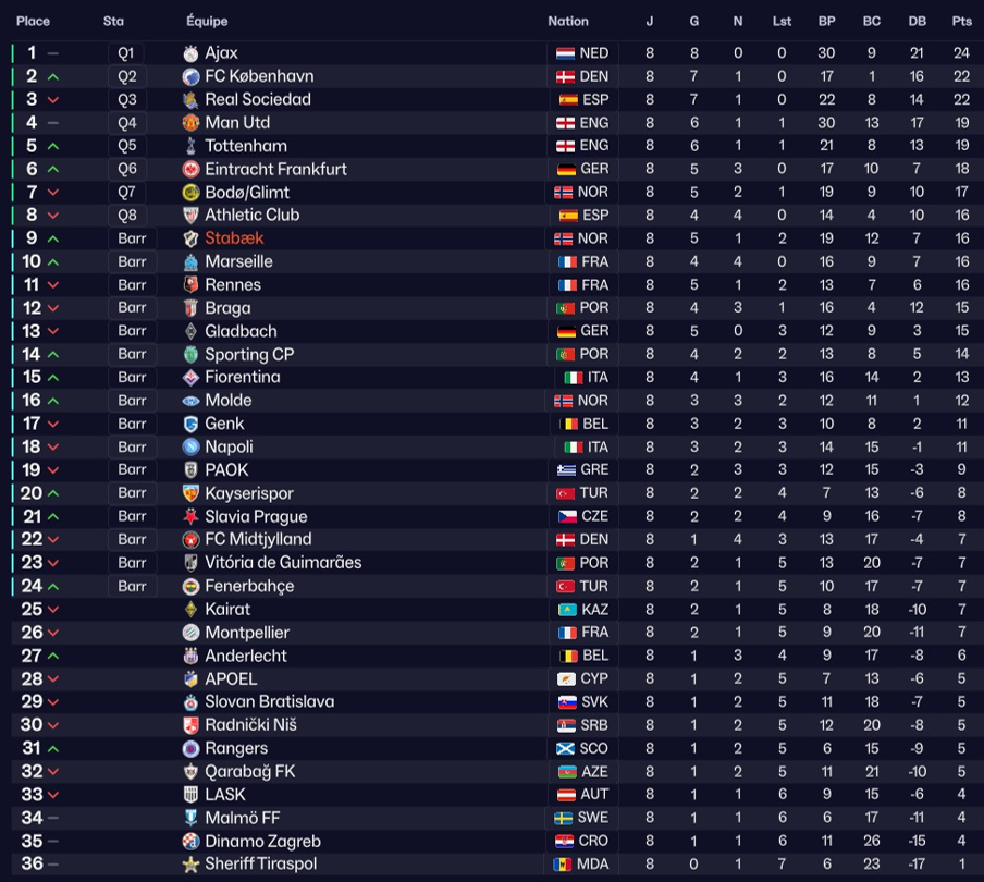 En Europa league, nous figurons à une bonne 7Úme place en championnat aprÚs 6 journées (sur 8). Il reste deux matchs a jouer face à Manchester United et le PAOK.
