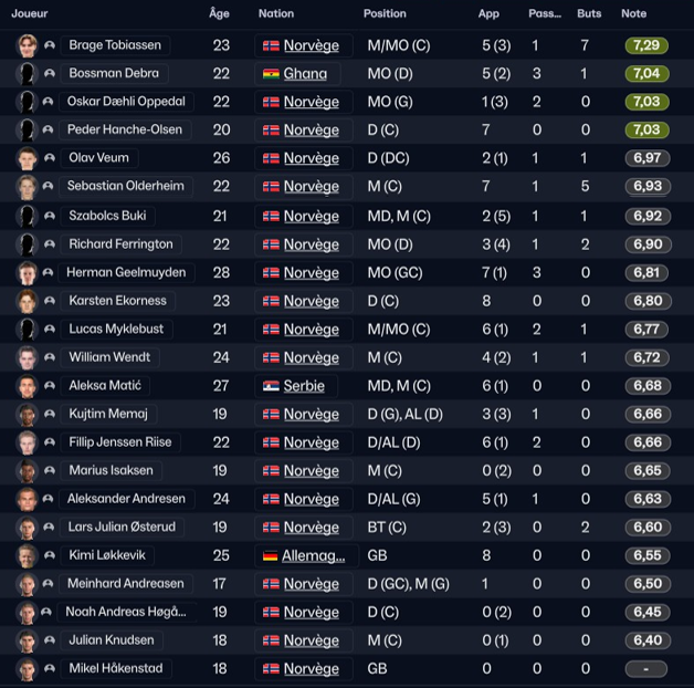 De bonnes stats dans lâensemble avec dĂ©jĂ deux joueurs dĂ©passant les 5 buts : Brage Tobiassen et Sebastian Olderheim