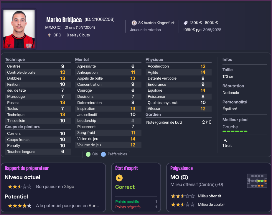 Enfin, l’Austria enregistre la signature du jeune milieu offensif croate Marko Brkljača, débarqué du PAS Giannina. Talent prometteur capable d’évoluer dans plusieurs rôles, il arrive auréolé d’une réputation grandissante. Un symbole familial également, puisque Marko n’est autre que le fils du directeur sportif du club, Mario Brkljača. Un recrutement qui témoigne de la confiance placée dans le potentiel du joueur, mais aussi d’une vision de long terme axée sur le développement.