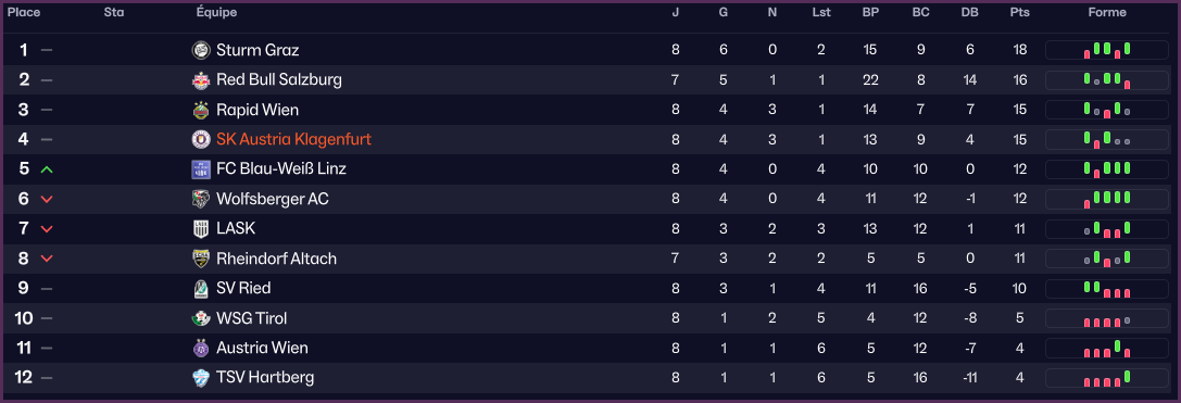 Avec ces derniers résultats, le SK Austria Klagenfurt se stabilise à une belle 4e place au classement avec une courte avance sur les premiers poursuivants. De quoi appréhender les prochains matchs avec sérénité.