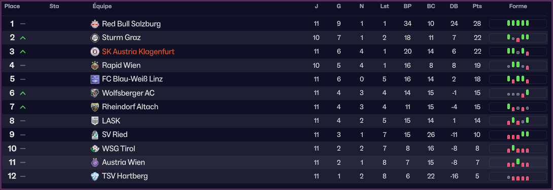 Le SK Austria Klagenfurt s’attendait à un mois d’octobre compliqué et ce fut effectivement le cas. Au retour de la trêve internationale, les Violets ont reçu Sturm Graz pour un match disputé, conclue par un nul. La rencontre suivante semblait être une formalité avant que l’équipe ne baisse de rythme et encaisse 2 buts coup sur coup dans le dernier quart d’heure, apportant une incertitude importante.
