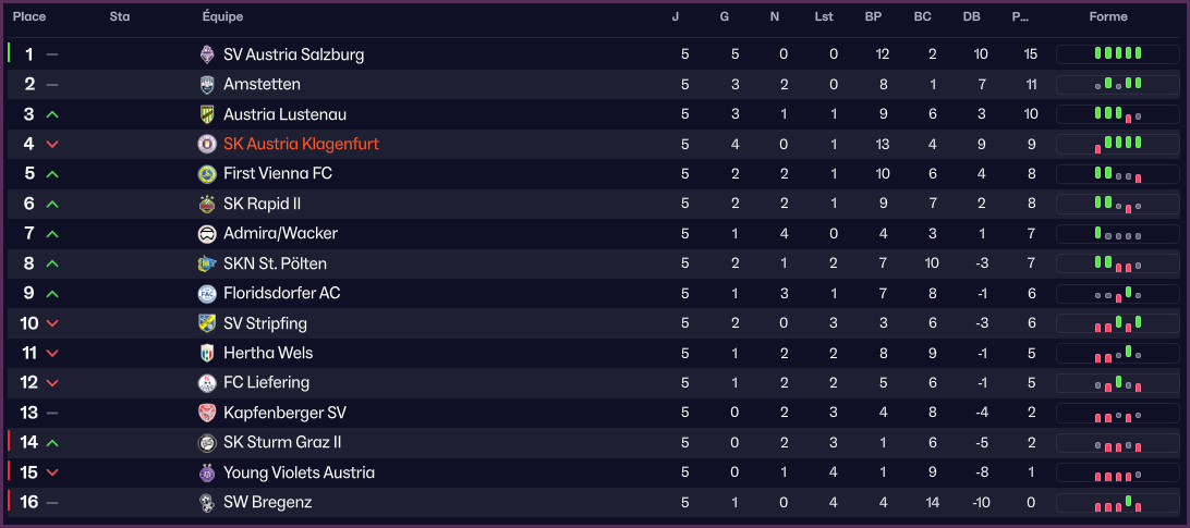 Au classement, le SK Austria Klagenfurt est au pied du podium à la suite du retrait de 3pts acté par l’ÖFB. C’est actuellement le SV Austria Salzburg qui occupe la tête après un départ canon (5 victoires en autant de rencontres).