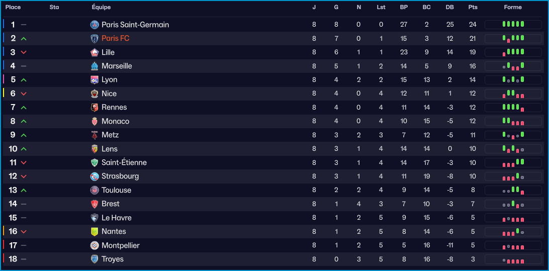 Malgré cette défaite face à Marseille, le Paris FC conserve sa place sur le podium, bien aidé par cette large victoire face à Lille. Le Paris Saint-Germain qui occupe la tête avance à un rythme de champion.