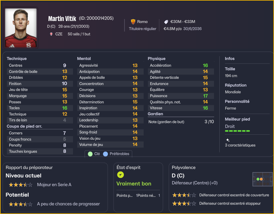 Ă€ 29 ans, Martin VitĂk arrive dans la force de l’âge. International tchèque reconnu, formĂ© au Sparta Prague, il avait choisi l’Italie Ă l’étĂ© 2025 en rejoignant Bologna. Un choix rapidement payant. En Émilie-Romagne, VitĂk s’est imposĂ© presque immĂ©diatement comme un pilier dĂ©fensif, conjuguant rigueur tactique et qualitĂ© de relance. AnnoncĂ© sur le dĂ©part avec insistance l’étĂ© dernier, il avait finalement poursuivi l’aventure bolonaise, avant de saisir cette opportunitĂ© romaine.