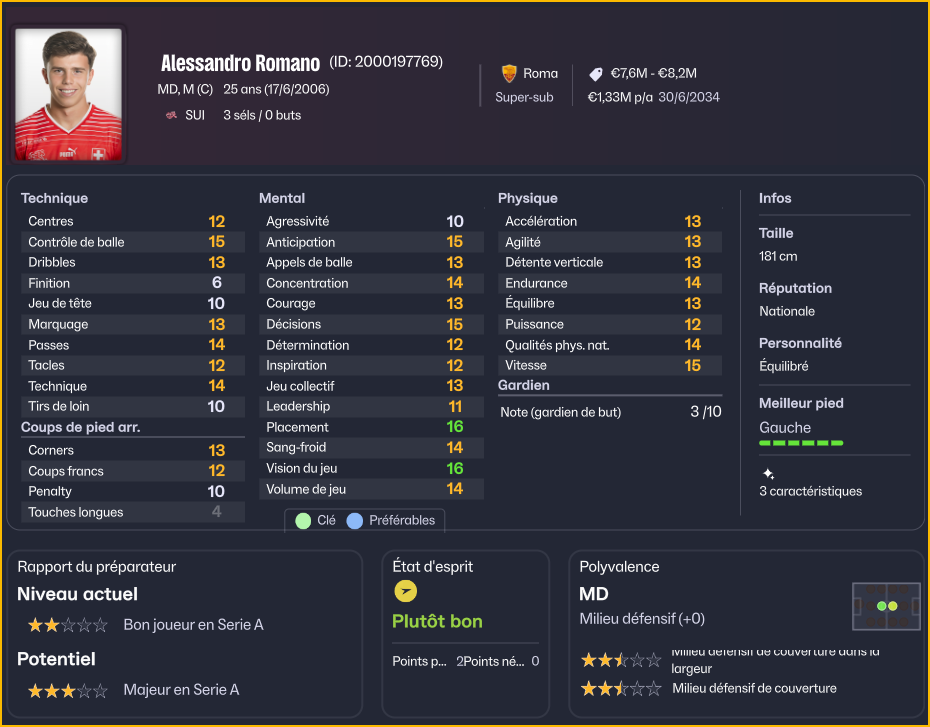L’autre officialisation du jour touche davantage à l’émotion. Alessandro Romano n’est pas un inconnu à Trigoria. Formé au club, le milieu défensif n’avait pourtant jamais réussi à s’y faire une place durable. En janvier 2029, le cœur lourd, il avait quitté Rome pour Zürich. Un exil salutaire. Révélation du championnat suisse, Romano a vu sa cote grimper en flèche avant de rejoindre l’Eintracht Frankfurt à l’été 2031.