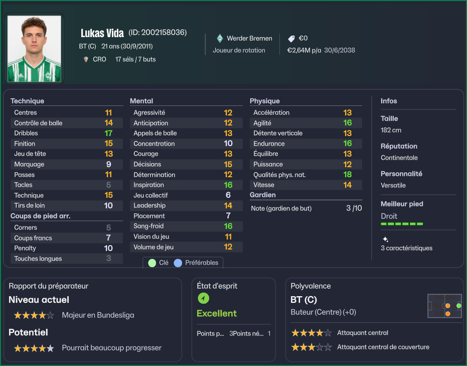 Car à Brême, l’efficacité offensive a trop souvent fait défaut la saison passée. Si le collectif a su compenser par sa solidité et son mental, la régularité devant le but a cruellement manqué dans les moments clés. Dans ce contexte, Vida arrive avec une opportunité en or : s’imposer rapidement comme la nouvelle référence offensive du club.
