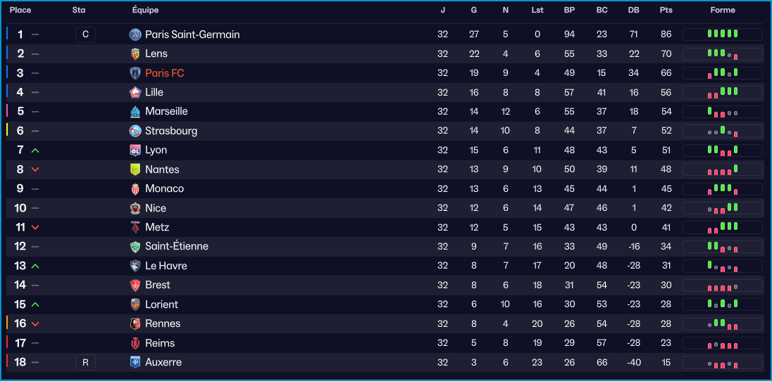 Alors quâil ne reste que 2 matchs Ă disputer, le Paris FC occupe la derniĂšre marche du podium et est assurĂ© dây rester. Une performance qui permet au club de la capitale de se qualifier pour la prochaine Ă©dition de la Champions League.