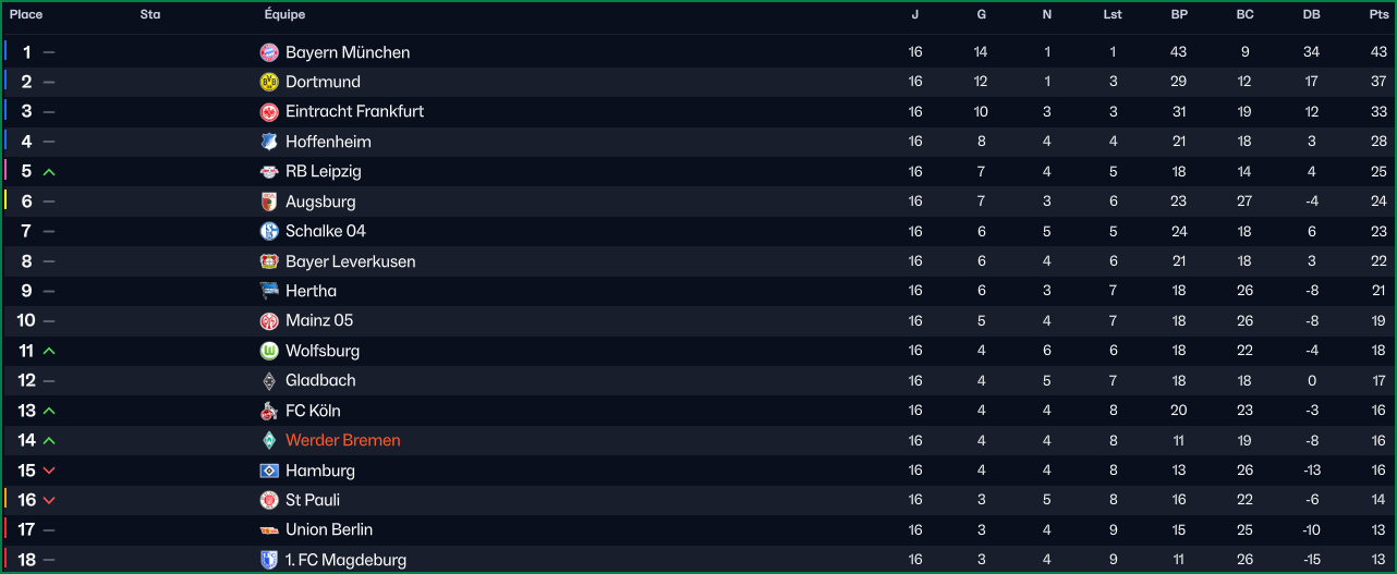 Au 01-12, le Werder Ă©tait lanterne rouge du championnat. Un mois pile plus tard, le club est remontĂ© Ă la 14Ăšme place, avec quelques points dâavance sur la zone rouge.