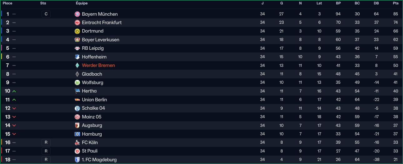 MalgrĂ© une entame de saison trĂšs complexe, le Werder termine sa campagne Ă une trĂšs belle 7Ăšme place, bien plus haut que ce qui Ă©tait attendu. Une performance magistrale qui mĂ©rite dâĂȘtre rĂ©itĂ©rĂ© dans les annĂ©es Ă venir.