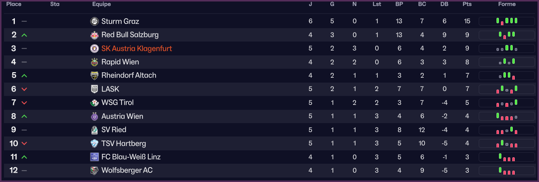 Grùce à ce bon début de saison, le SK Austria Klagenfurt occupe la troisiÚme marche du podium avec une courte avance sur le Rapid Wien mais un match de plus.