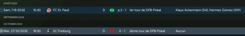 Nous passons pas sans mal ce 1er tour car il faudra attendre les prolongations pour que nous puissions sortir St Pauli. Au tour suivant, nous tombons sur Fribourg, un adversaire qui sera trop fort pour nous.