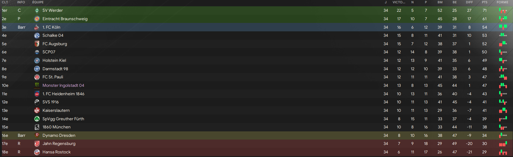 Il s’agit d’un championnat composé de 18 équipes les 2 premiers montent directement et le 3e joue un barrage contre le 16 de Bundesliga. En fin de classement, c’est pareil … les 2 derniers déscendent et le 16 joue un barrage contre le 3e de D3