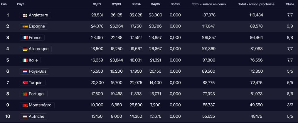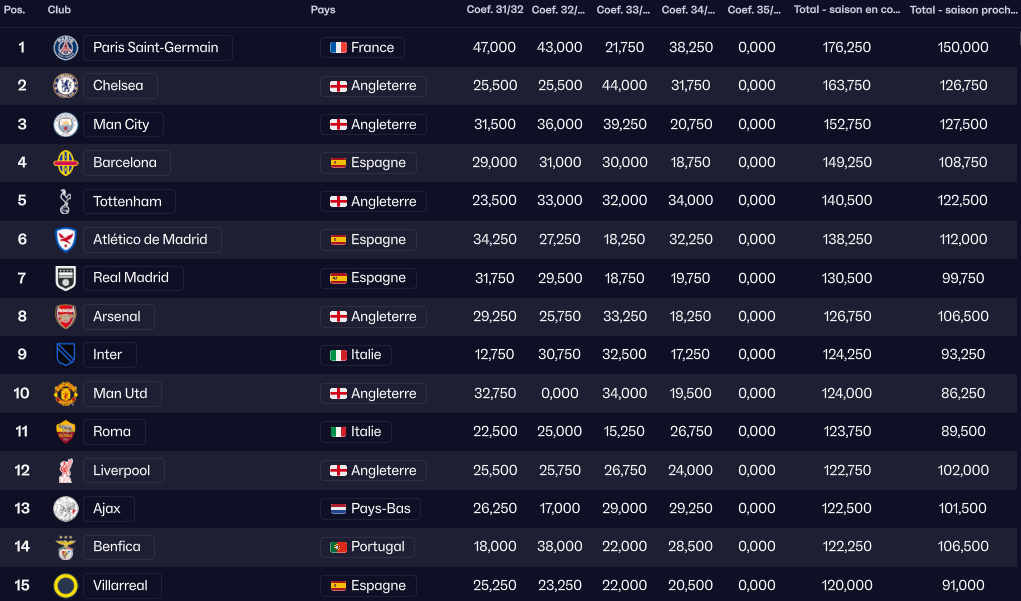 Coefficient des clubs |